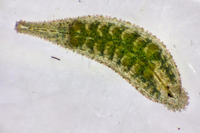 凱達格蘭蝦 (Neocaridina ketagalan),紅色圓圈內肉色的物體為水蛭,將水蛭從蝦上移除後,蝦子沒多久就陣亡了。 40X 解剖顯微鏡下的水蛭。